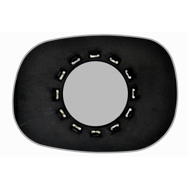 Змінний елемент автодзеркала асферичної форми, яка встановлюється в корпус дзеркала. Завдяки спеціальній випуклій геометрії поверхні водій отримує розширений кут огляду та ефективний контроль за ситуацією на дорозі в сліпих зонах. На світлині елемент дзеркала зі зворотної сторони.