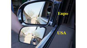На фотографіях дзеркала для США та європейської версії абсолютно ідентичні за розміром та взаємозамінні. Зверніть увагу на автомобіль у мертвій зоні. Крім того, американське дзеркало на авто візуально здається менше.